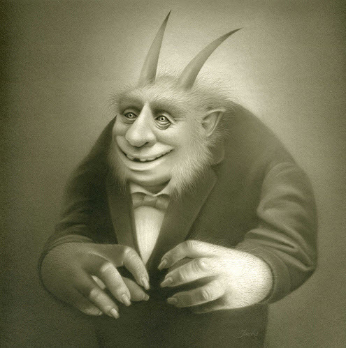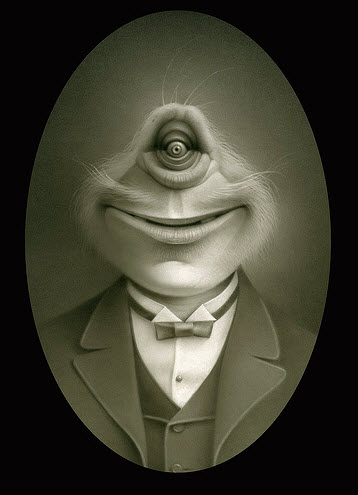 I think Brooklyn artist, Travis Louie, probably gets it too. He specializes in what I’d call Victorian monster portraiture. His mythical beings appear to be upper-class elites, each possessing a personality and unique story. I spent a good hour looking through his paintings and reading the little blurbs that tell their tales.  It’s a little like digging up a photograph-filled time capsule on an alien planet. He does a fantastic job of creating mysterious little worlds that leave you wanting to know more.