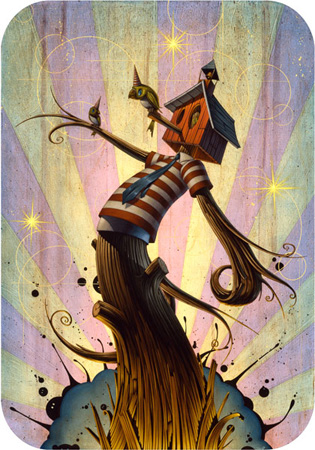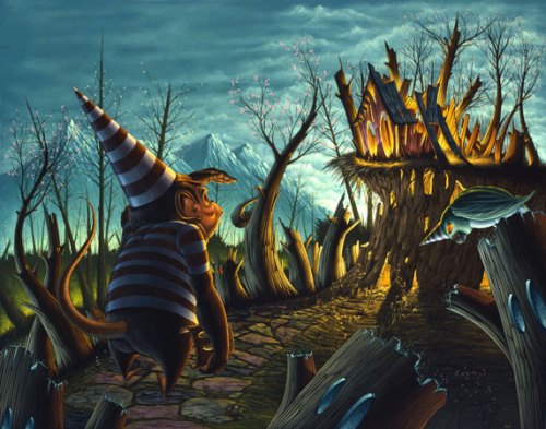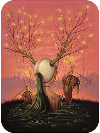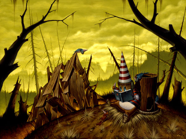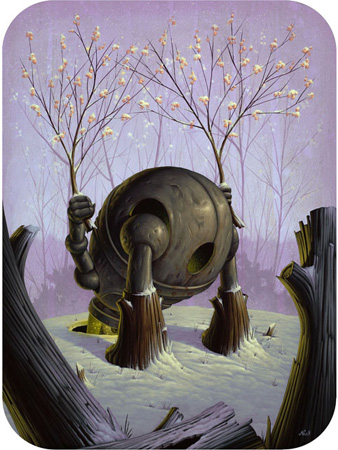 Nathan Ota is  painter and illustrator based out of California whose influences include graffiti and comic book artists. He creates eerie worlds where trees are a living force who twist themselves into every being’s existence and the animal kingdom has developed a taste for pointy hats. I particularly love his images containing robots who appear to have become obsolete in a bizarre future where a thriving nature has driven technology out of existence. If the Matrix had an alternate reality, this would be it.