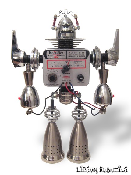 New York based Lipson Robotics, is the mastermind and creator responsible for these uber cool sculptures. They’re composed of random pieces found at thrift stores, recycle shops, junkyards, retail stores, construction sites and off of the street. Think Bender from Futurama meets a 1957 Chevy Bel Air and they decide to swap scraps. I love the idea of owning something that was created through a scavenger hunt, of sorts. If only the individual pieces could tell their life stories!